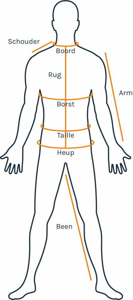 - Krop: Du kan bestemme størrelsen ud fra dine kropsmål. Mål altid omkredsen af din krop og tag højde for nogle ekstra centimeter bevægelsesfrihed. Vælg derefter den størrelse, der ligger tættest på dine kropsmål. Sørg altid for at placere målebåndet korrekt, så du får en så præcis sammenligning som muligt. For at hjælpe dig kan du nedenfor læse, hvordan du bedst måler de forskellige mål.